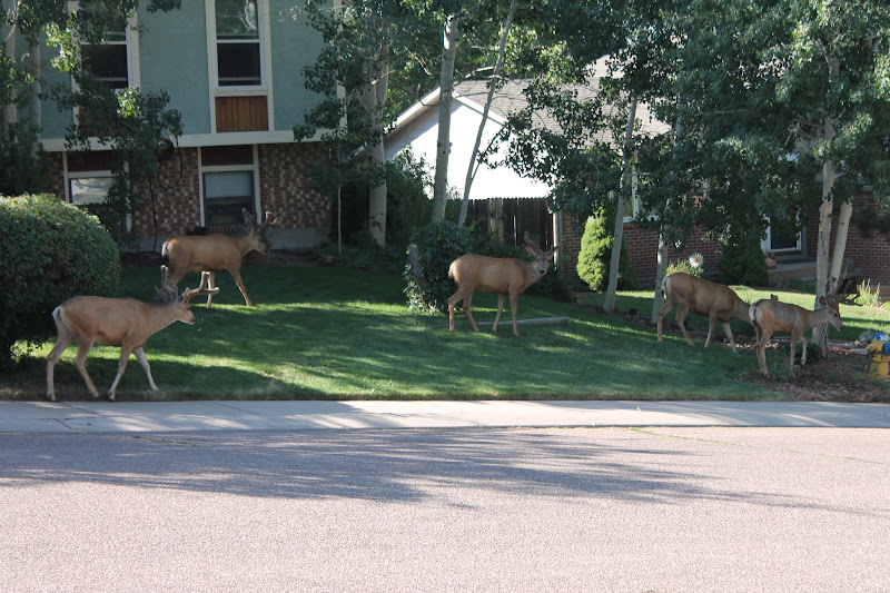 FIVE bucks....the house in the background is straight across the street from ours. It's not unusual to see deer in town on occasion, but I've never personally seen any in our neighborhood before. I'm assuming that they were pushed into town from the fire several days prior. They walked down the sidewalk and back up again before turning the corner and disappearing around this intersection.